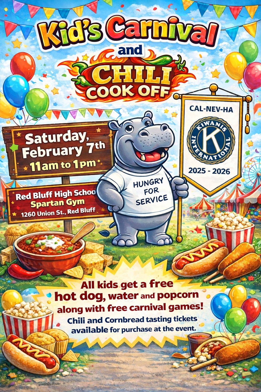 Join Kiwanis & Key Clubs from across Northern California for a FREE family fun event featuring kid’s carnival games, bounce houses, face painting, a cupcake walk, and more! Enjoy our Chili & Cornbread Cook-Offs and help pick the People’s Favorite! Kids ages 2–11 eat FREE (hotdog, popcorn & water) and get a passport to play carnival games.