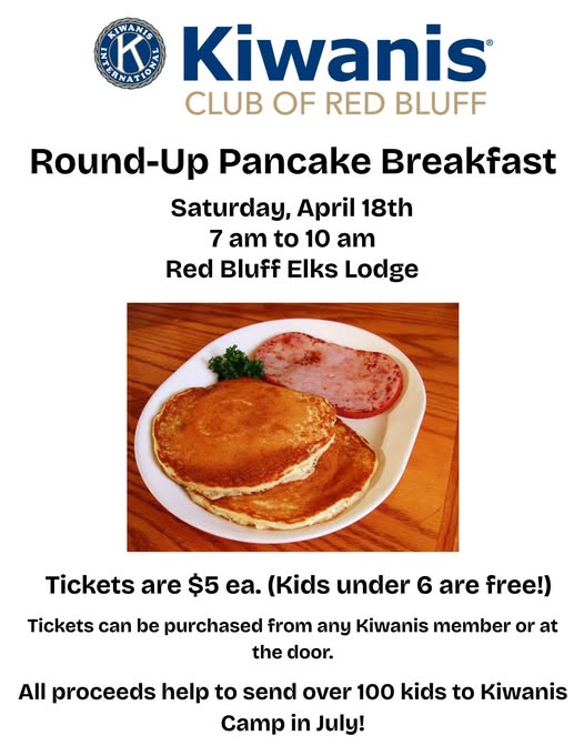 The Red Bluff Kiwanis Club’s annual Round-Up Pancake Breakfast is set for Saturday, April 18th from 7 am to 10 am. This amazing community tradition is held at the Red Bluff Elks Lodge and tickets are $5 each. Children under 6 are free! For the low, low price of just $5, you get big, fluffy pancakes with a slice of grilled ham and all you can drink coffee, milk and orange juice. What a steal!!!! We haven’t increased our prices in over 20 years – take your family out for the last remaining affordable breakfast and help keep this annual Round-Up community tradition going! You can purchase tickets from any Red Bluff Kiwanis member or tickets will be available at the door on the day of the event. **We will also have a “to go” option for those that need to set up early for the parade or for anyone else that can’t stick around to enjoy this super fun community gathering. Please remember there may be a short wait for to go orders. All proceeds help to send over 100 kids to our annual Kiwanis Camp this summer so gather your family and friends for this annual tradition! #KidsNeedKiwanis#KiwanisNeedsYou#KiwanisPancakeBreakfast